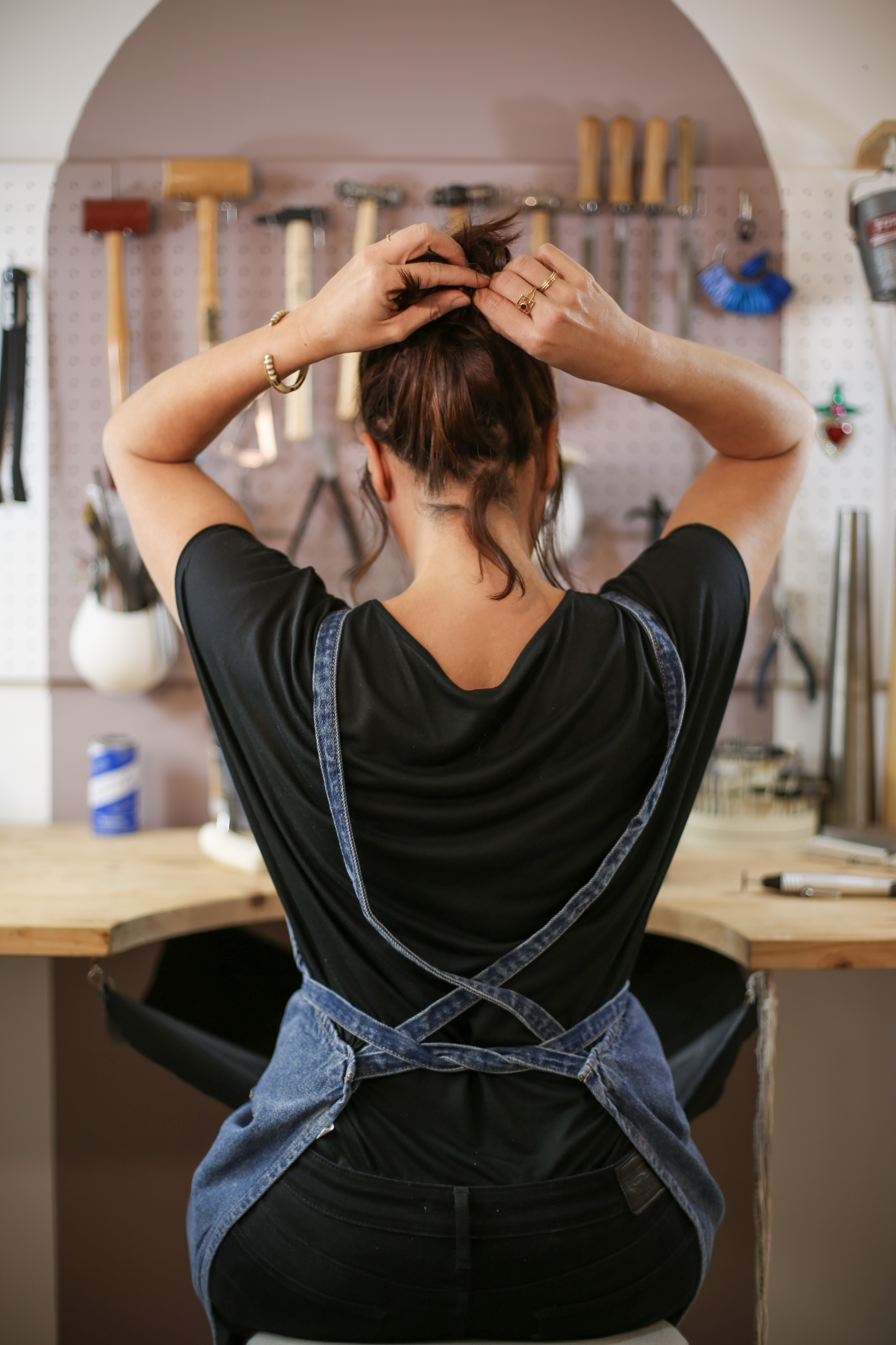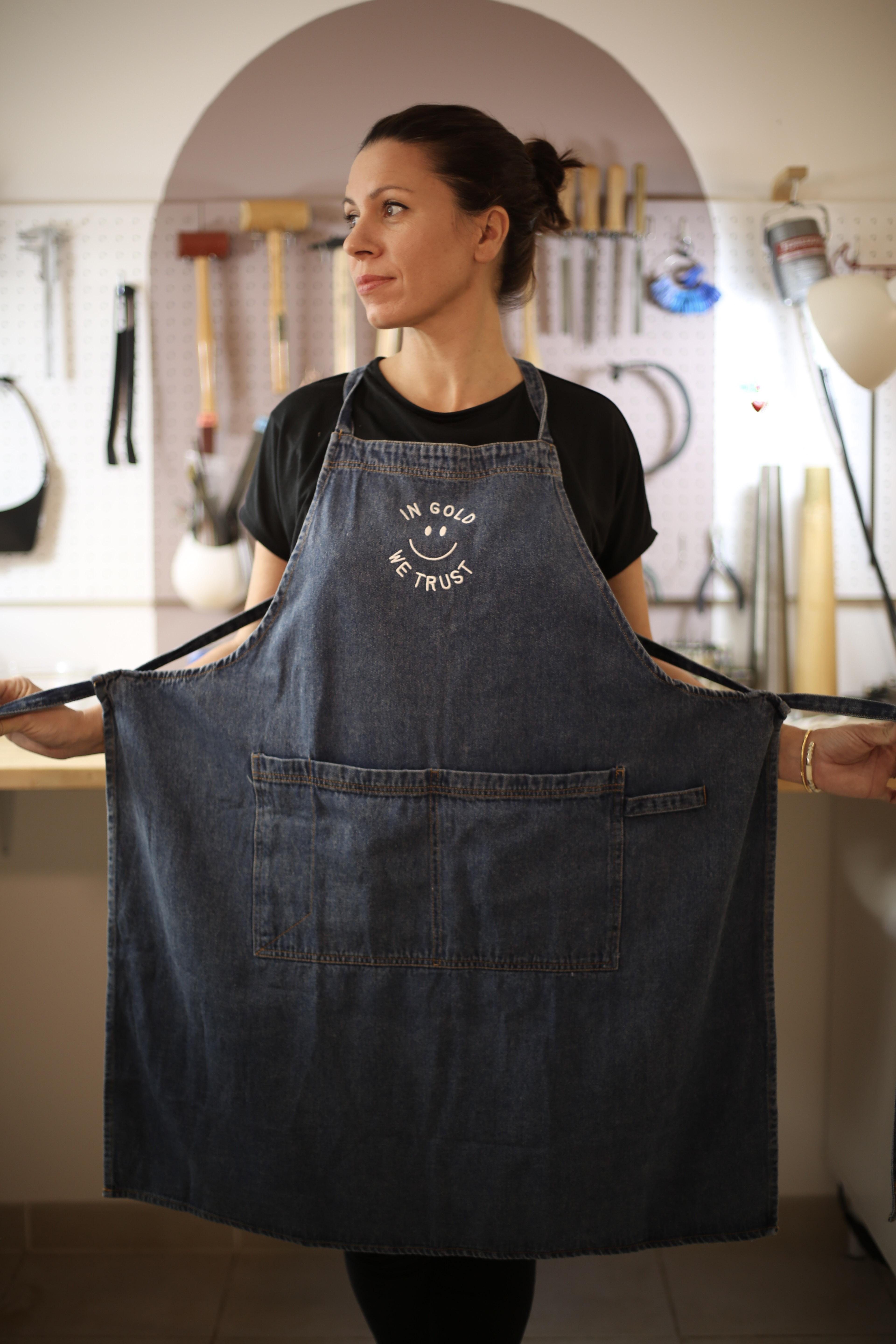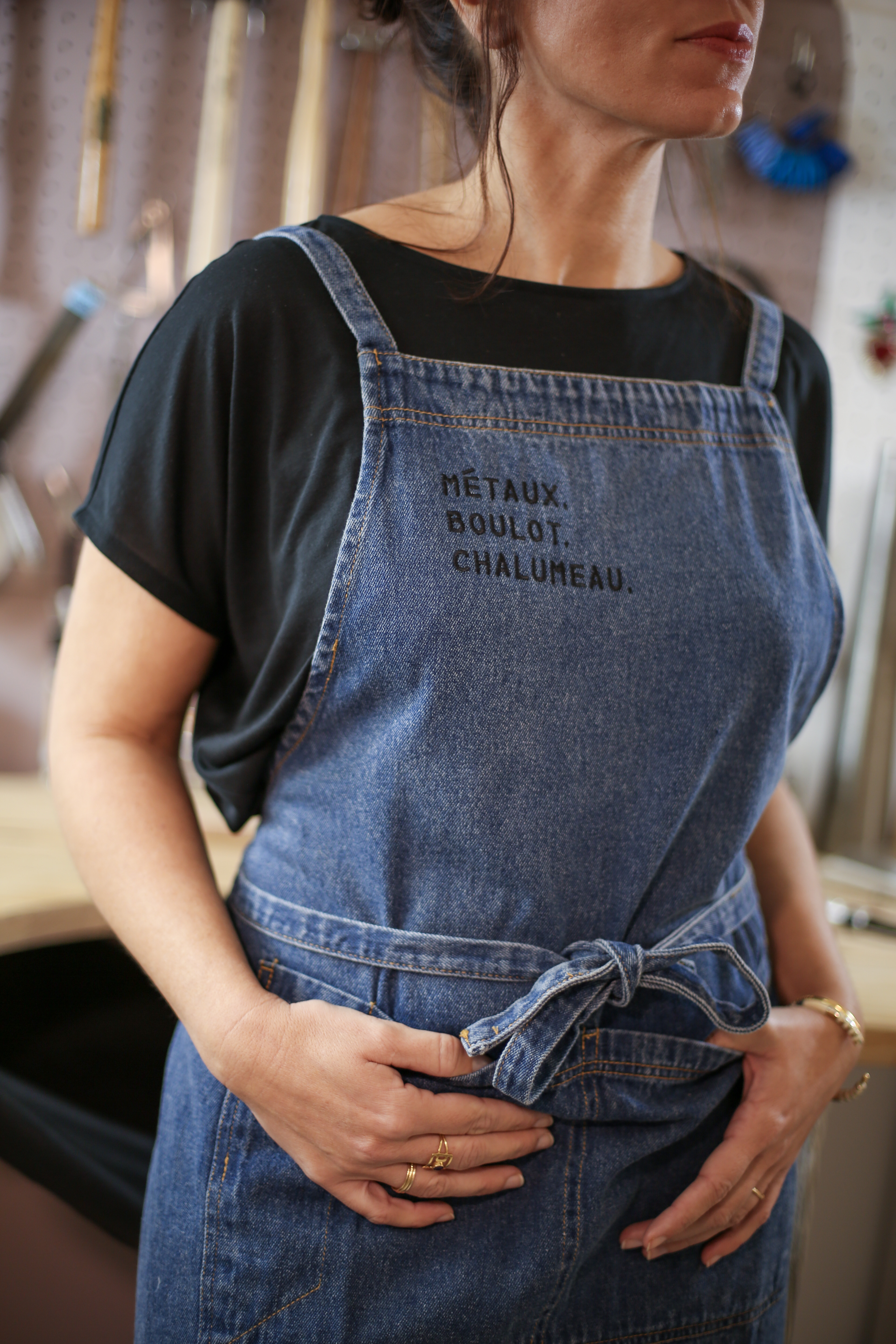 Son tissu jean est à la fois souple et résistant. Sa longueur généreuse protégera vos jambes (idéal pour rattraper le métal brûlant ou les petites pierres baladeuses).